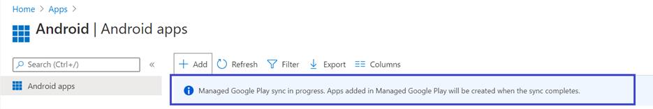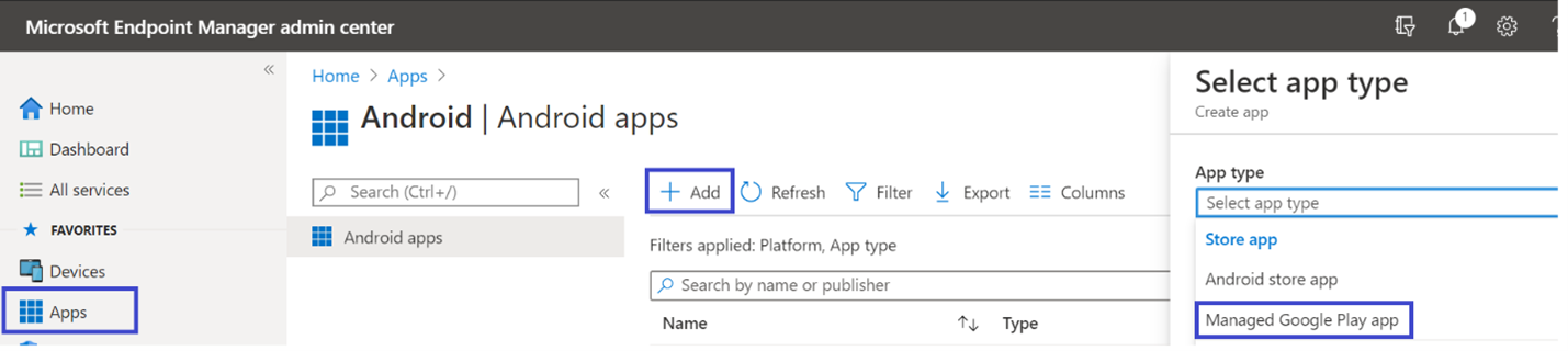 - In Microsoft Intune admin center , go to Apps > Android Apps > Add and select Managed Google Play app.