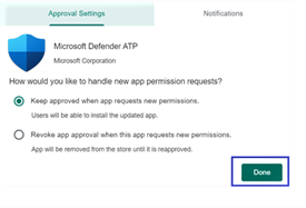 - On the Approval settings page, review your preference to handle new app permissions that Defender for Endpoint on Android might ask. Review the choices, and then select your preferred option. Then, select Done.