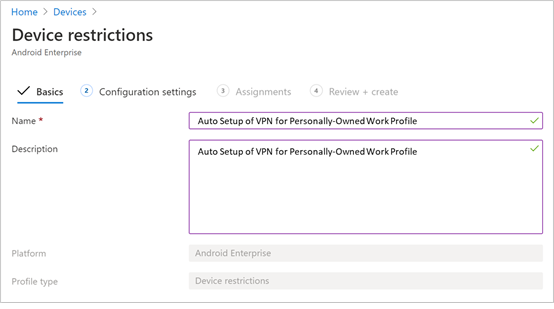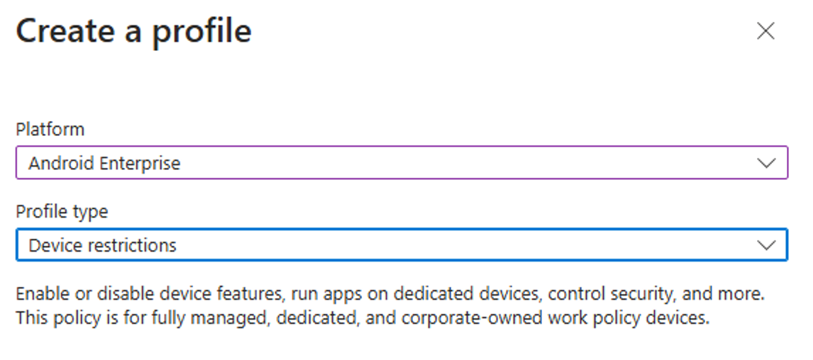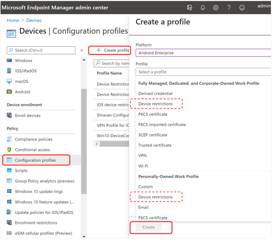 - On Devices, select Configuration Profiles > Create Profile > Platform > Android Enterprise. Select Device restrictions under one of the following, based on your device enrollment type: