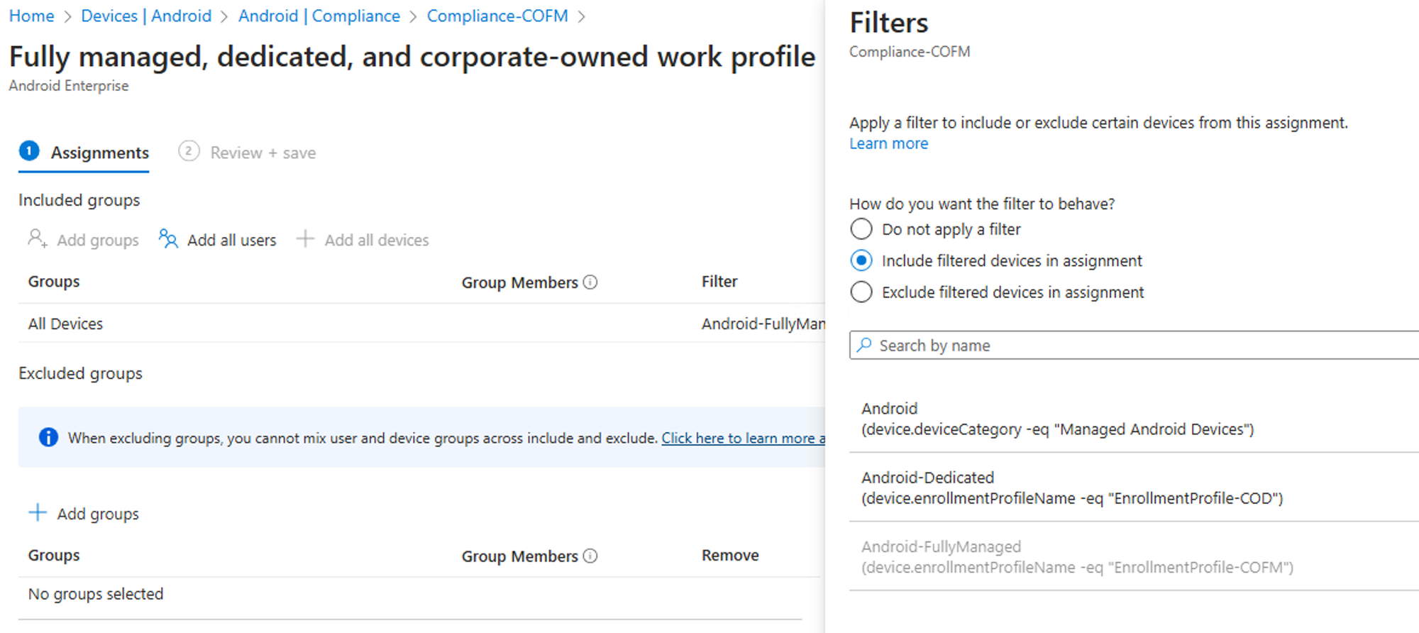 - In the Assignments page, select the user group to which this app config policy would be assigned. Select Select groups to include, select a group, and then select Next. The group selected here is usually the same group to which you would assign Microsoft Defender for Endpoint Android app.