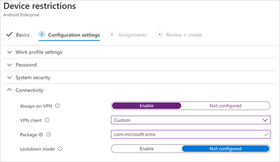 Defender for Endpoint supports device configuration policies for managed devices with Microsoft Intune. This capability enables you to use auto setup of always-on VPN on Android Enterprise enrolled devices, so the end user doesn't need to set up a VPN service while onboarding.