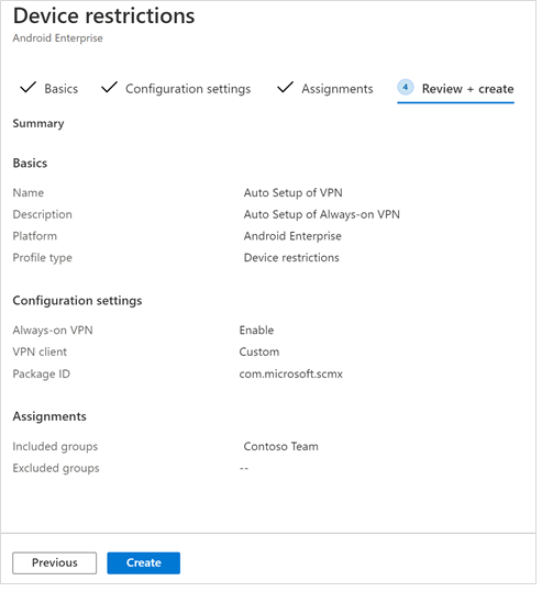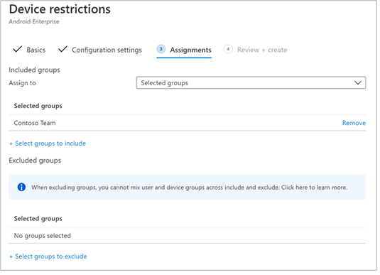 - In the Review + Create page that comes up next, review all the information and then select Create. The device configuration profile is now assigned to the selected user group.