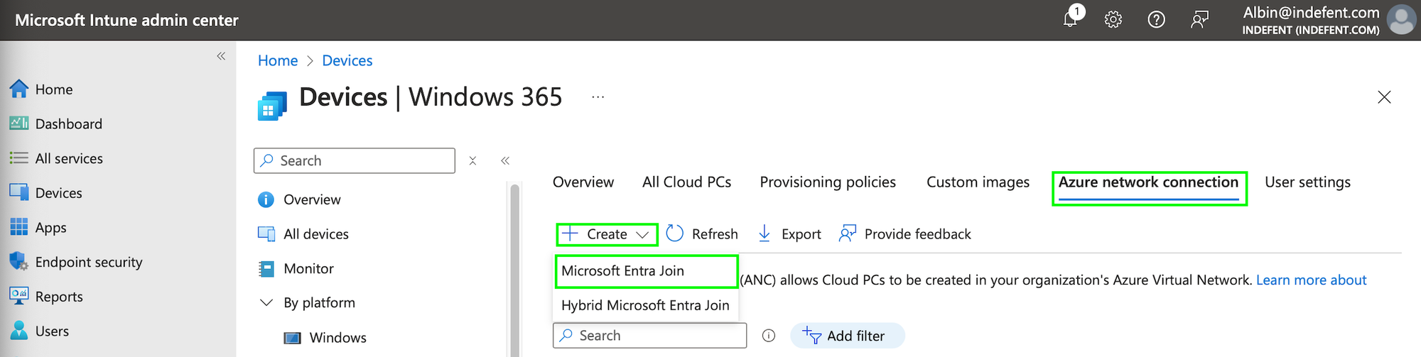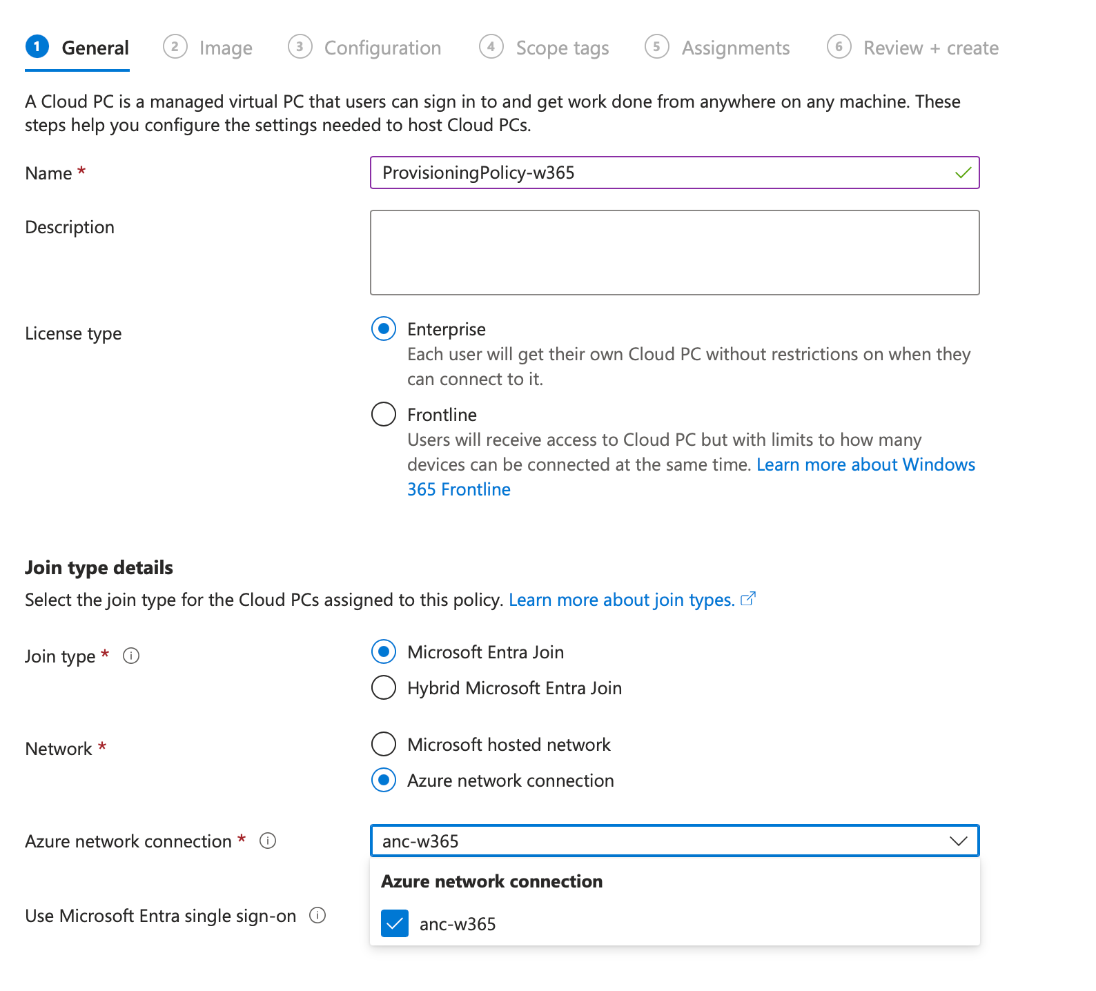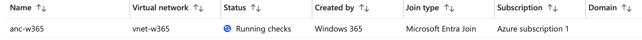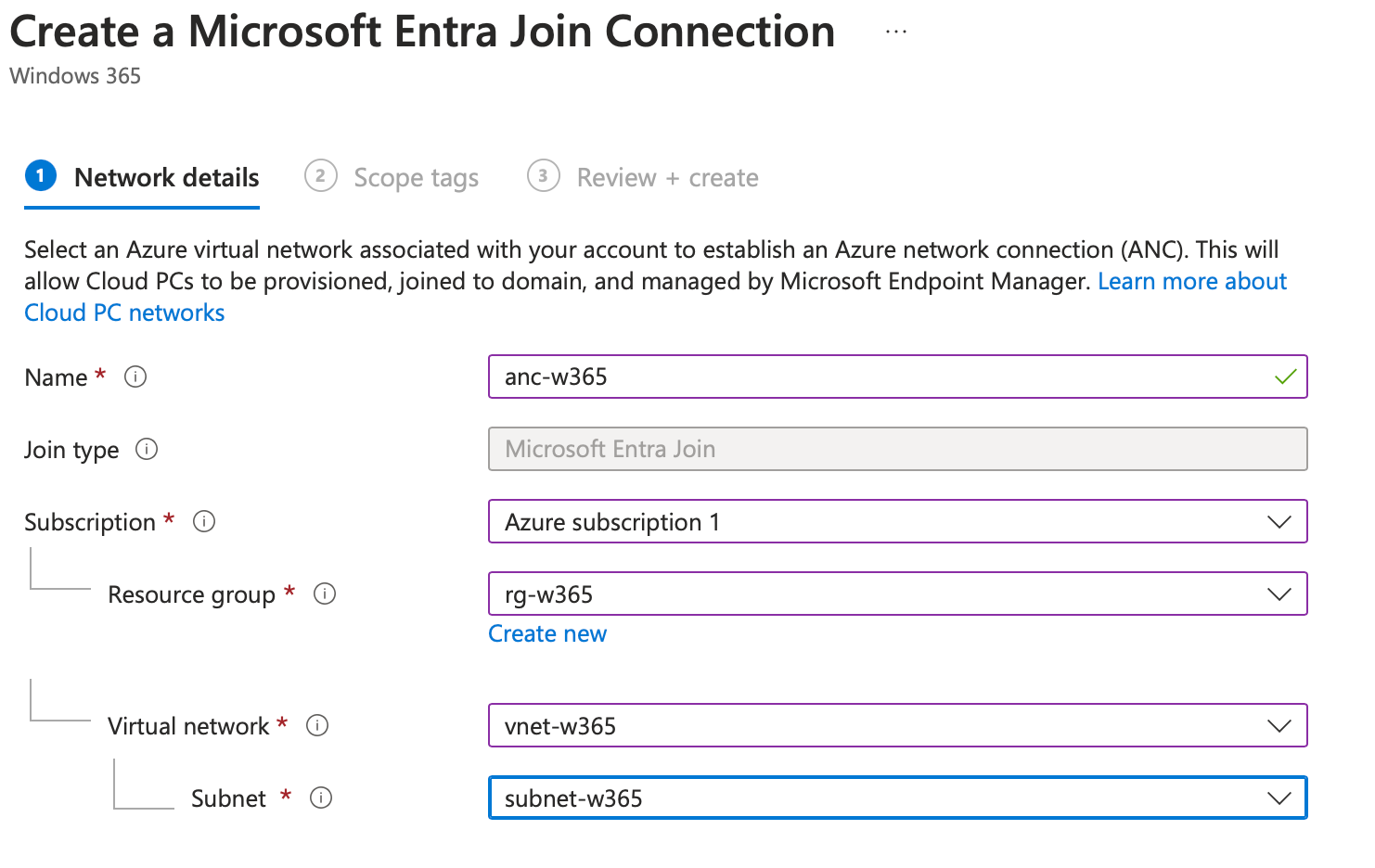 As we know the way to go is Entra Joined we follow that path and create the Azure network connection with the resources we created in the previous step: