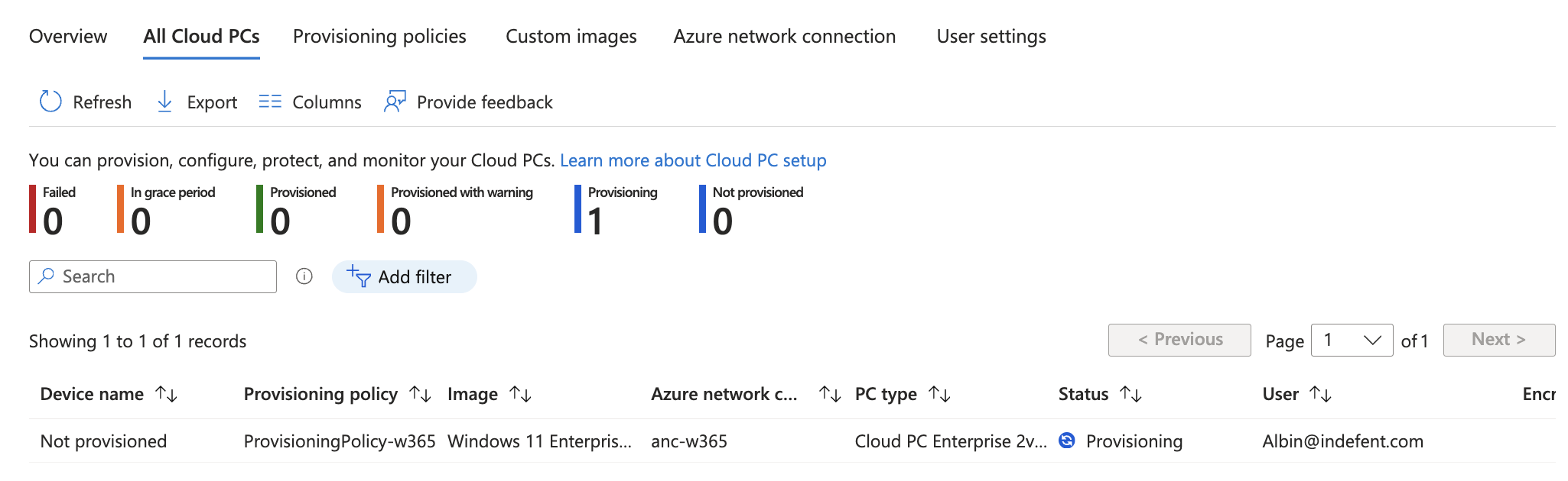 You should now see the Cloud PCs being provisioned for your selected users which you made a group member of the assigned group