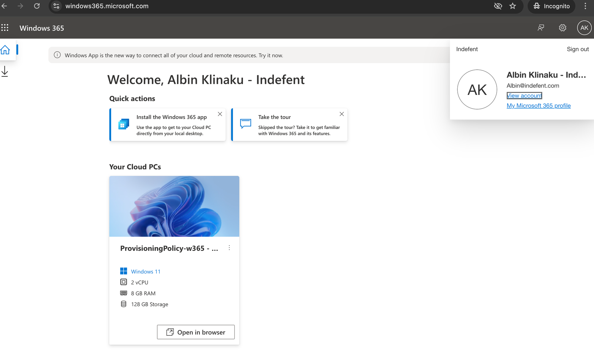 After the Cloud PC has been provisioned you should be able to connect onto it either through the Web or the Windows App:
