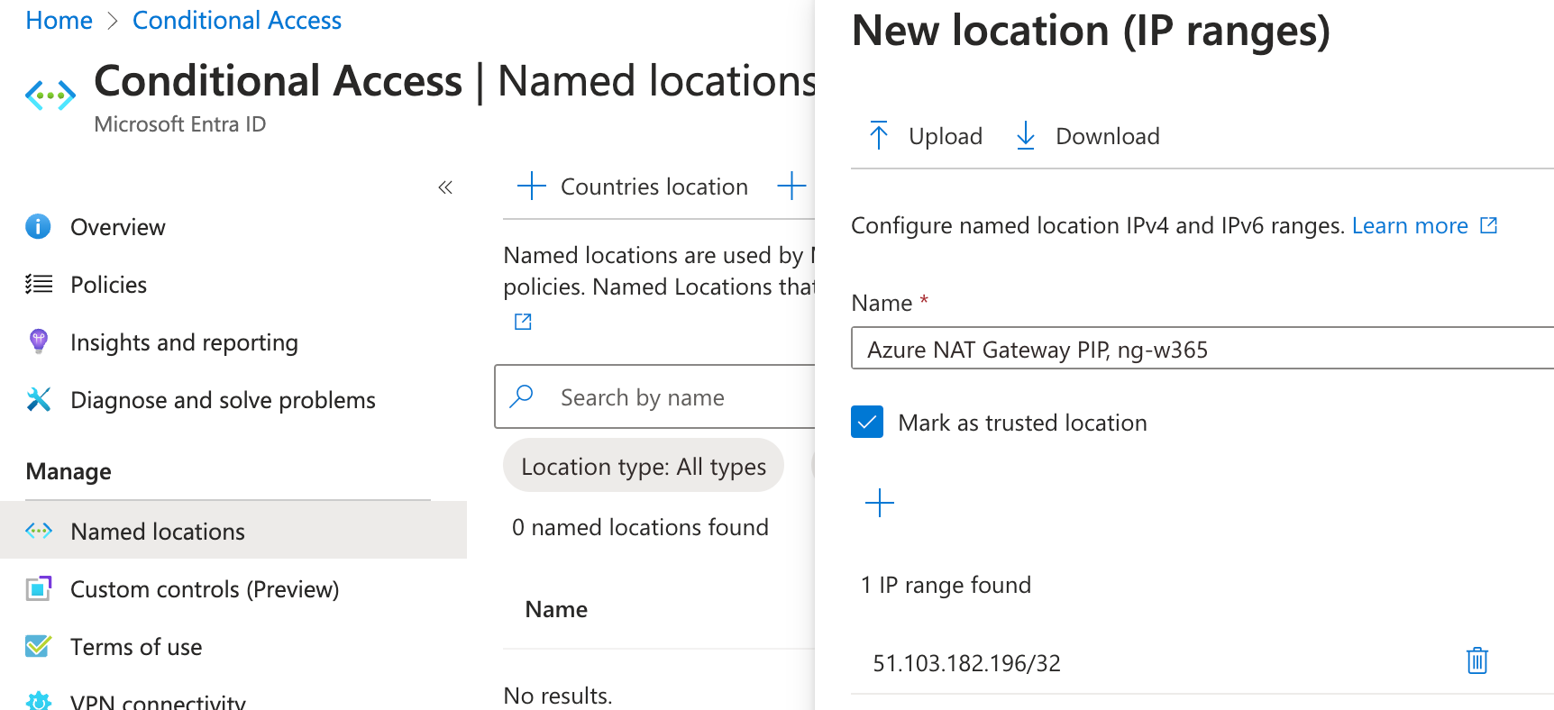 Let's go ahead and create now our lock down Conditional Access Policy. Firstly you should create a named location with our received public IP.